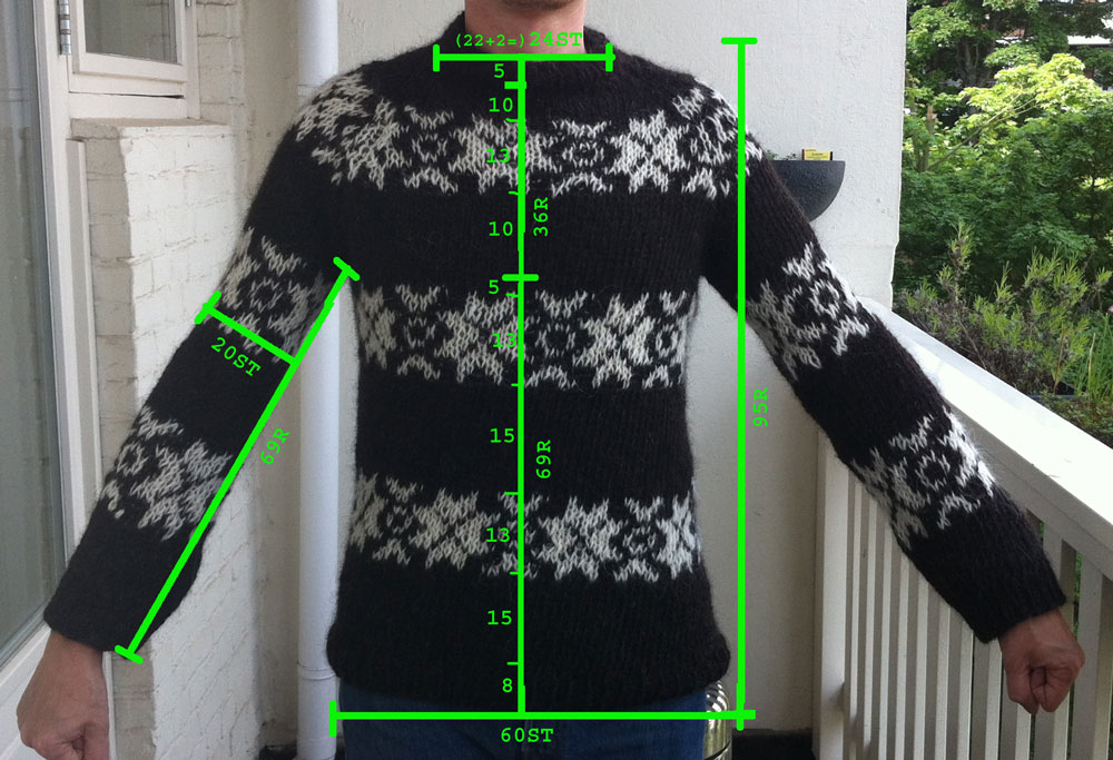 Voor een vrouwenmaatje zet ze voor het lichaam 120 steken op, dat leek me erg veel. Bovendien vond mijn man dat ik maar eens een trui voor hem moest breien, “ja déze”, “ja ik trek hem aan”, “ja ook naar mijn werk” — dus ik besloot de trui voor hem te gaan maken, maar wist niet zo zeker of ik dan wel de goede maten zou hebben. Ik liet het Faroe-patroon even voor wat het was en ging met de superhandige customize-your-own-raglan instructie uit het Superstar Knitting boek van Stich&Bitch aan de slag. Meten, tekenen, omrekenen…