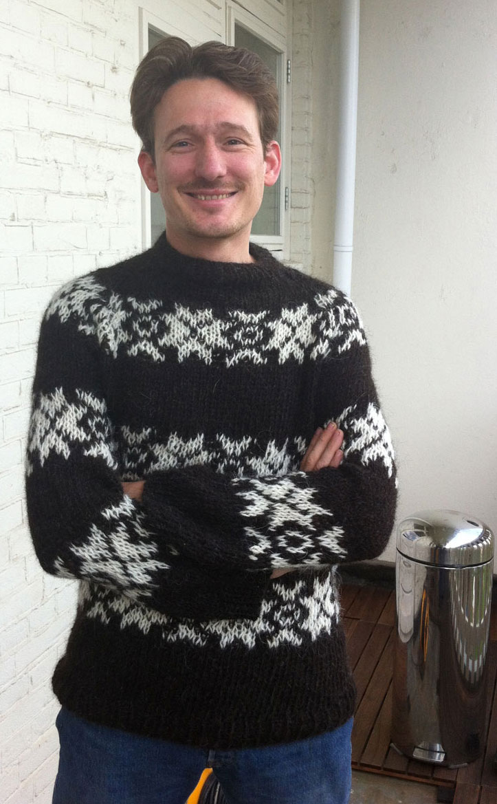 Dus hier is ie. Mijn eerste trui. Zelf uitgevogeld en gemaakt. Man erin en klaar. Hij past goed en na twee keer wassen stinkt hij bijna niet meer! 😉 (de trui dan). Het is een wonder hoe je die stinkende kriebelbollen kunt omvormen tot een superlekkere, zelfs zachte comforttrui… Je haalt hem bijna droog uit de wasmachine, hij is heel licht én warm. Je mag hem zelfs tot 40 graden wassen – als je durft. Hij kriebelt niet (of veel minder dan je zou verwachten) en alle katten zijn er direct verliefd op.